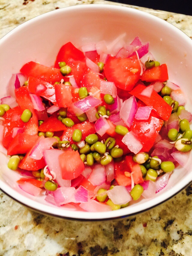 For my side of vegetables, I diced up some red onions and tomatoes and mixed it with green lentil sprouts with a pinch of salt to taste. This delicious meal only takes 30 minutes to make!